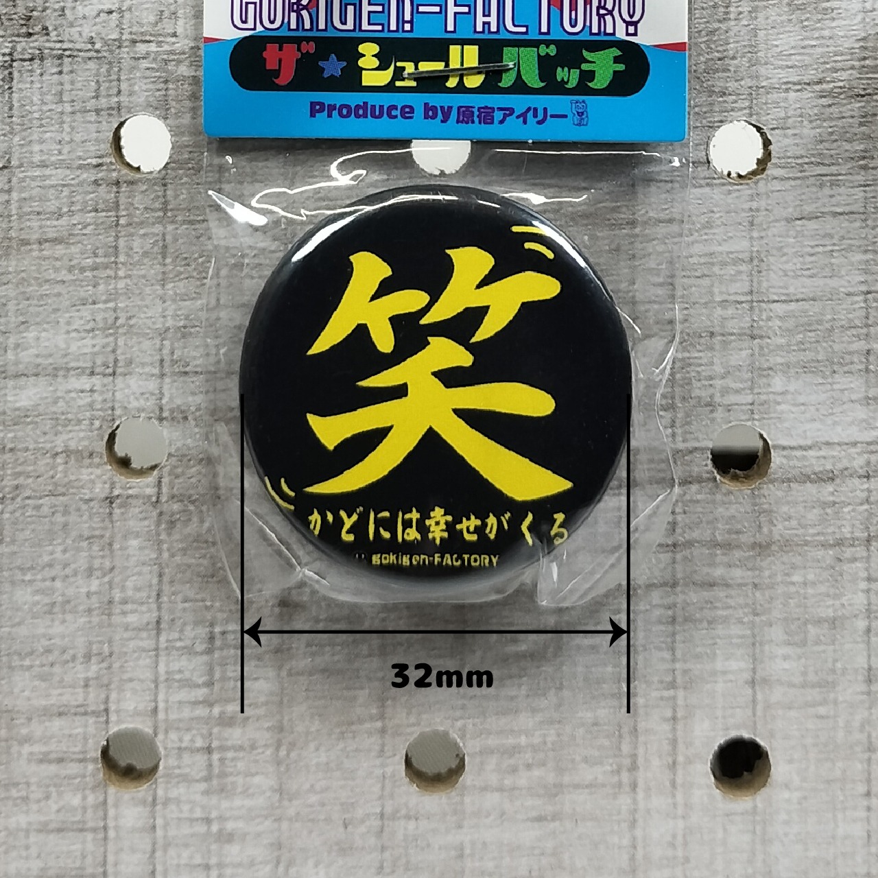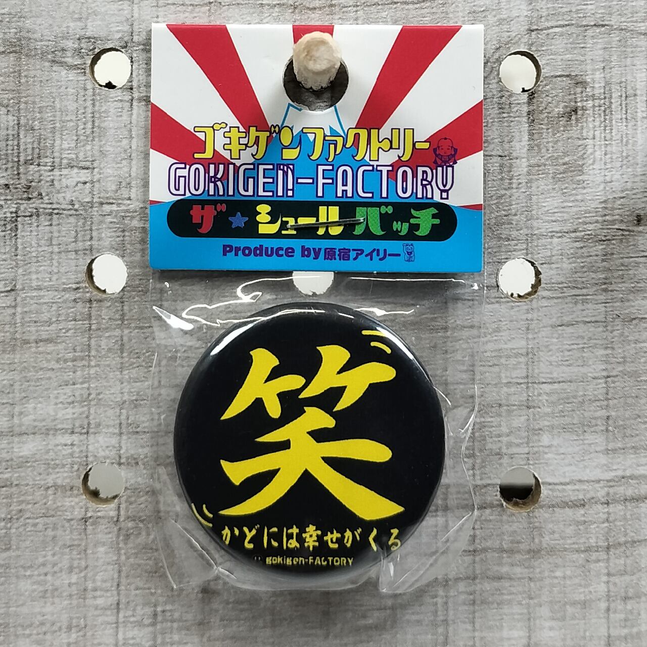 笑うかどには幸せがくる 缶バッチ おもしろ 32mm HAPPY 笑顔 幸福 ポジティブ 日本語 ゴキゲンファクトリー GOKIGEN-FACTRY