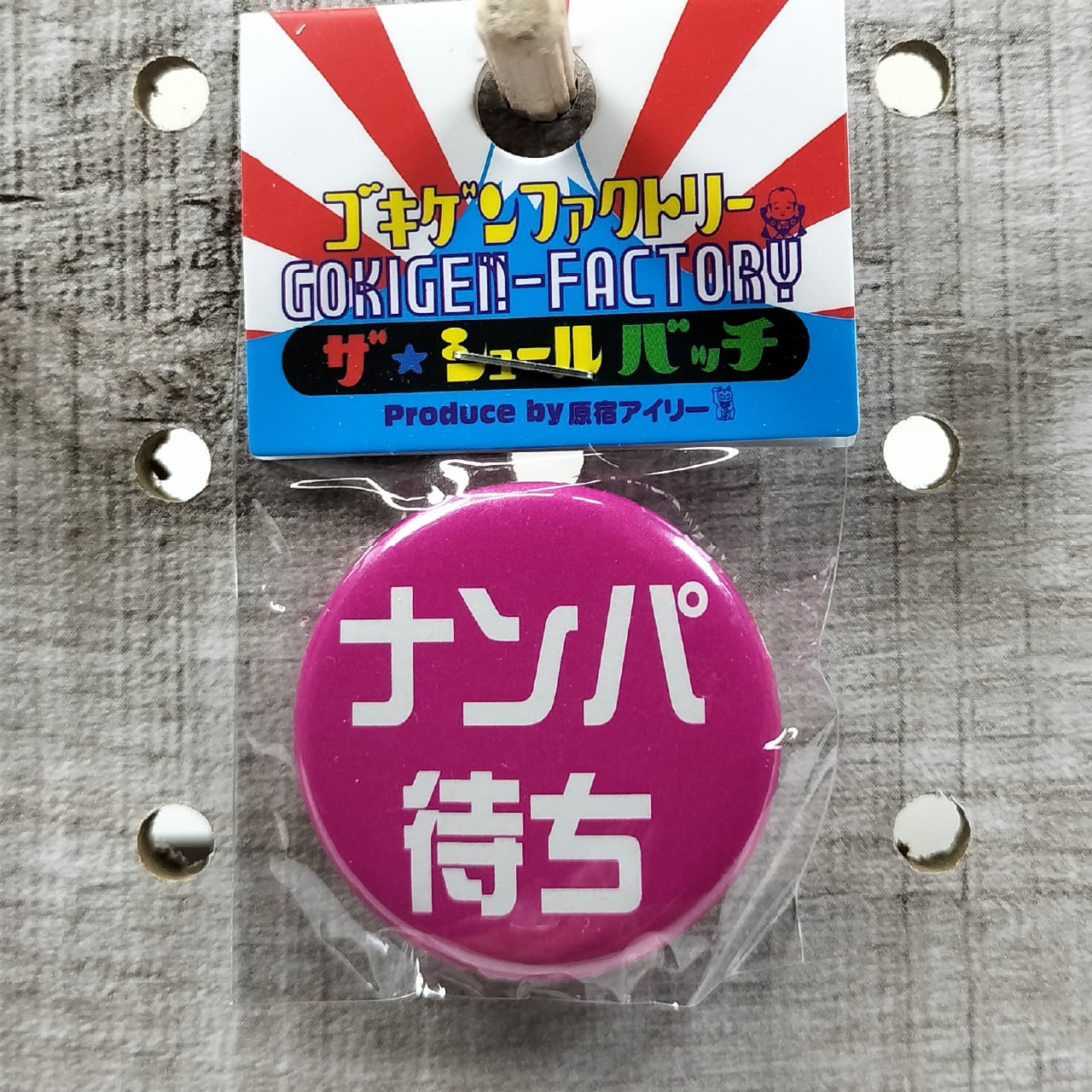 ナンパ待ち 缶バッチ おもしろ 32mm 声かけられるのを待つ お誘いを待つ 呼び止めを待つ 仕掛ける たらしこむ ゴキゲンファクトリー GOKIGEN-FACTRY