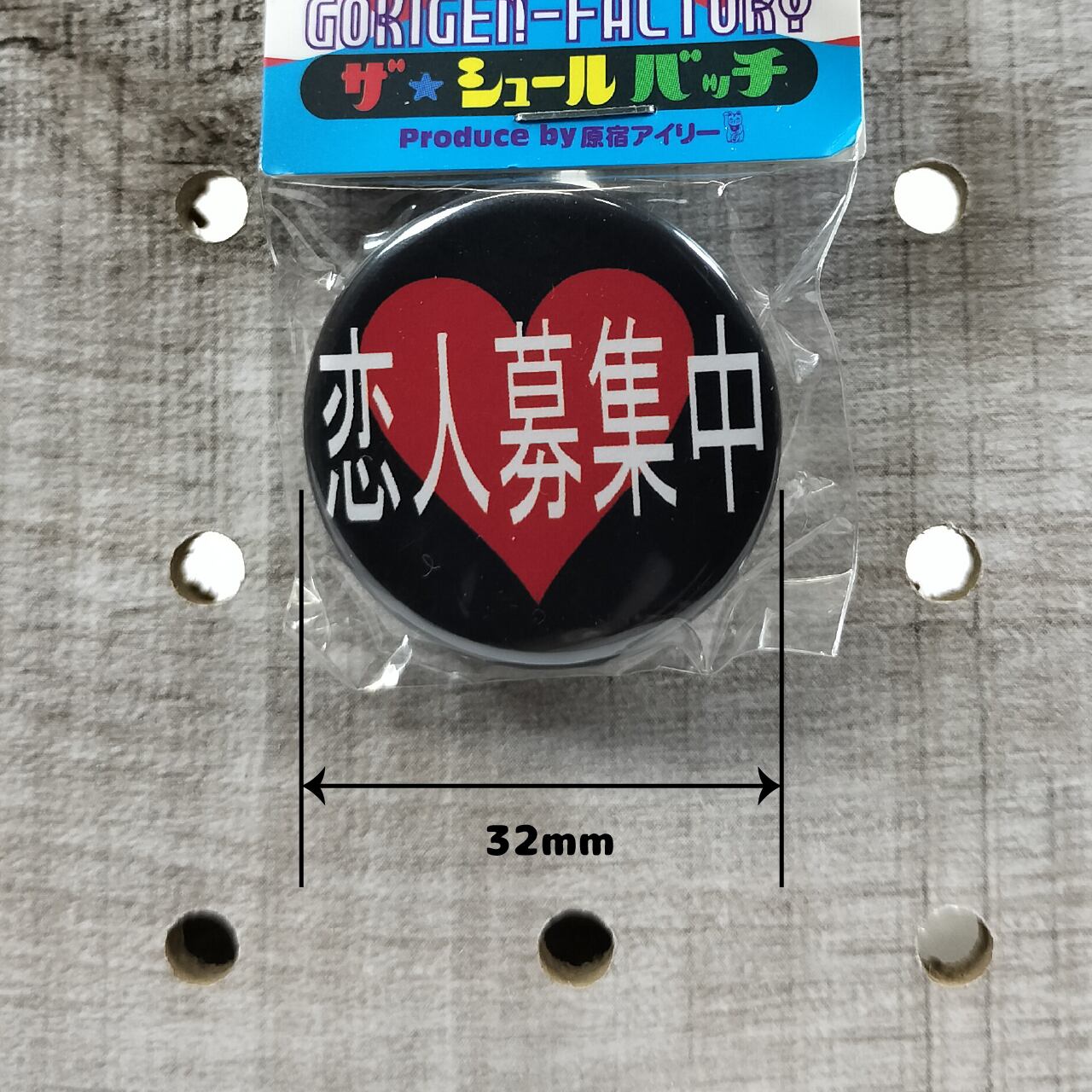 恋人募集中 黒 缶バッチ おもしろ 32mm 彼氏募集中 彼女募集中 恋愛相手探し どしどし募集中 日本語 ゴキゲンファクトリー GOKIGEN-FACTRY