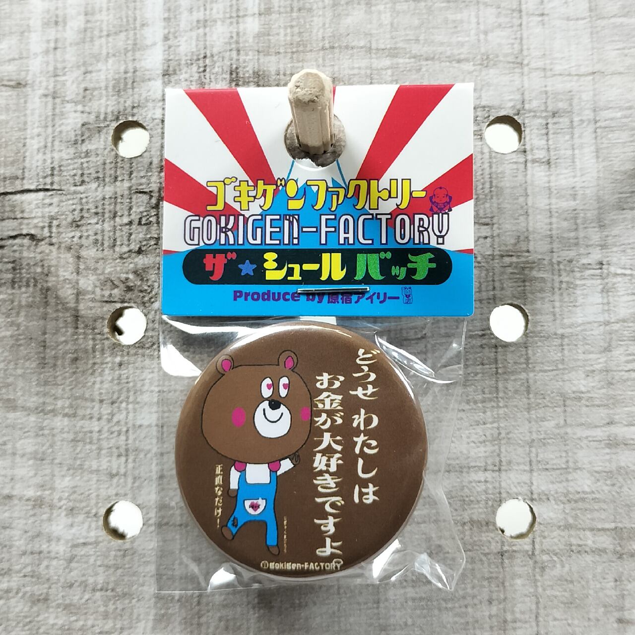 自虐 お金大好き 缶バッチ おもしろ 32mm 金銭欲 強欲 貪欲 人間 日本語 ゴキゲンファクトリー GOKIGEN-FACTRY