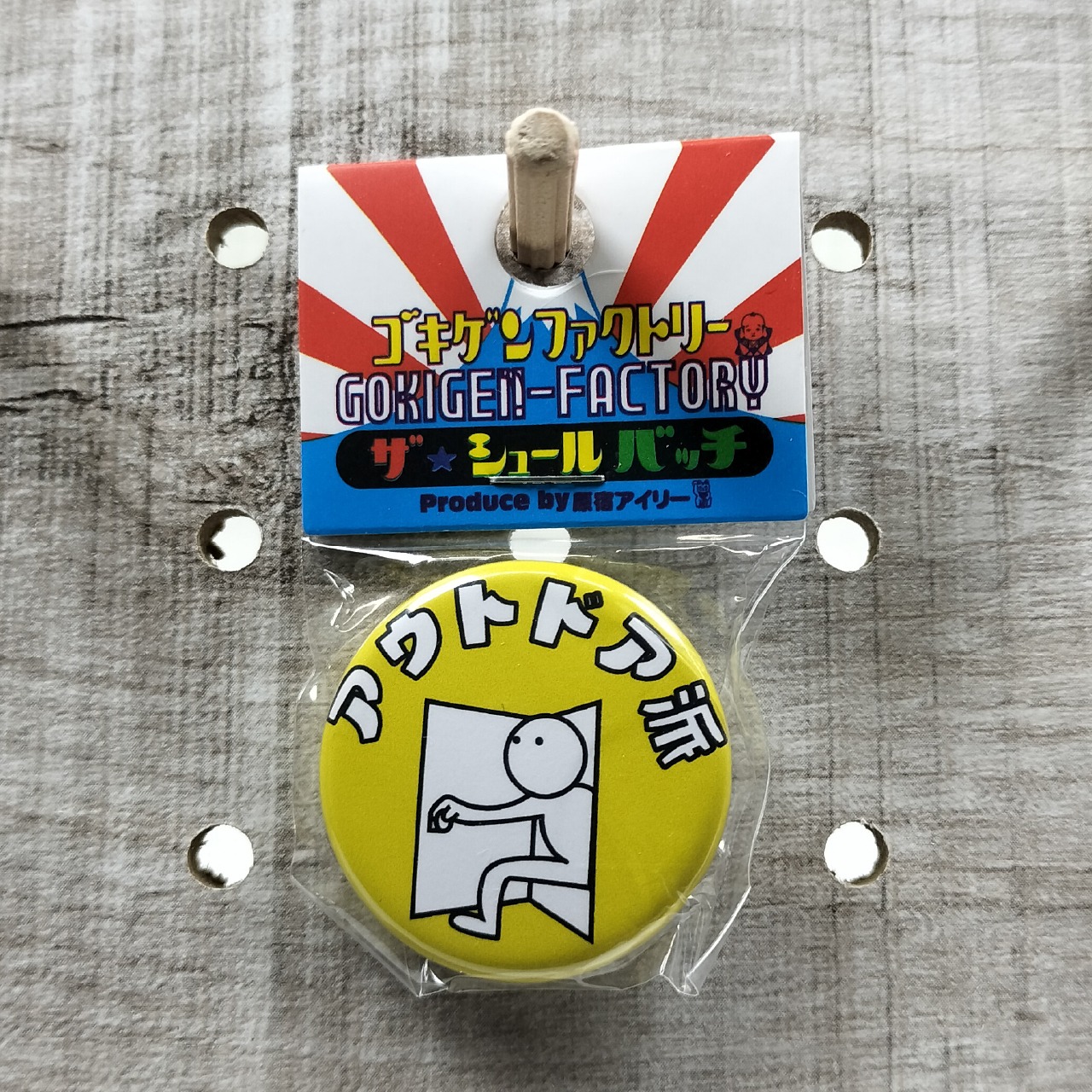 アウトドア派 缶バッチ おもしろ 32mm 野外 キャンプ 陽キャ 日本語 ゴキゲンファクトリー GOKIGEN-FACTRY