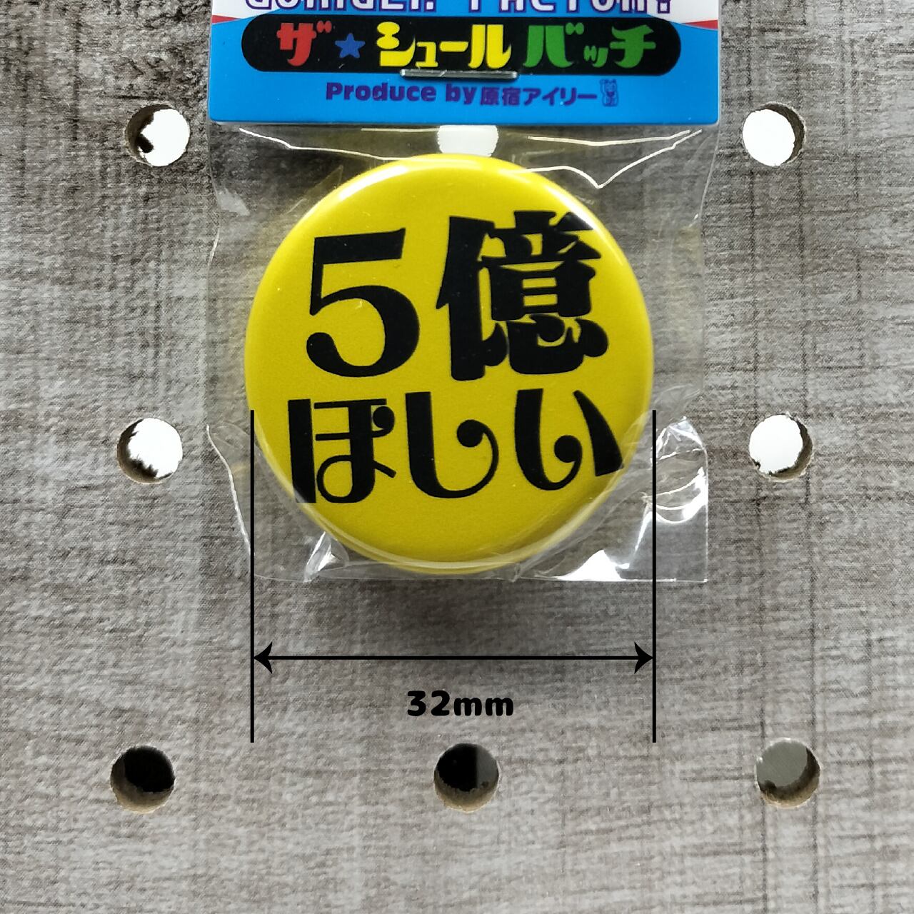 5億ほしい 缶バッチ おもしろ 32mm 願望 欲望 お金 宝くじ 日本語 ゴキゲンファクトリー GOKIGEN-FACTRY